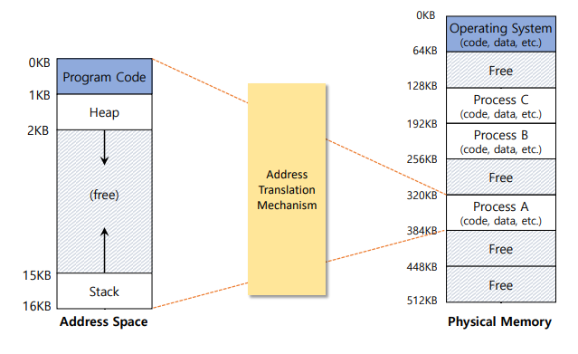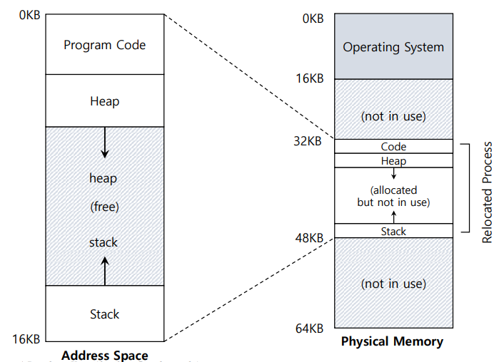 => OS는 프로세스를 물리적 메모리에 저장한다(주소 0이 아님), 하지만 주소공간(가상메모리)은 0에서부터 시작한다