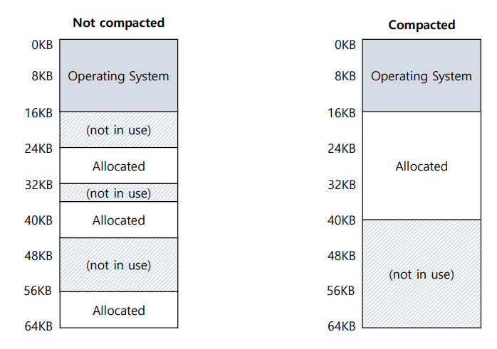 - Compaction (압축) : 물리적 메모리에서 기존 세그먼트를 재정렬