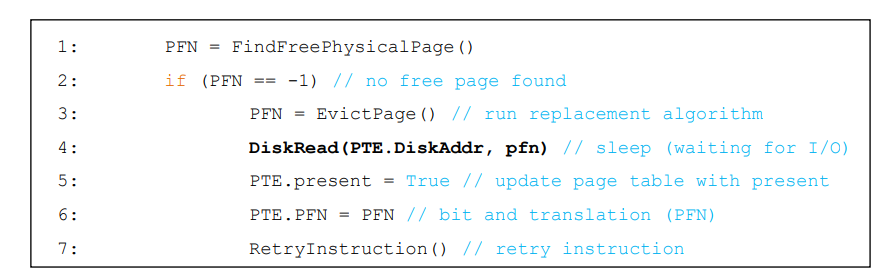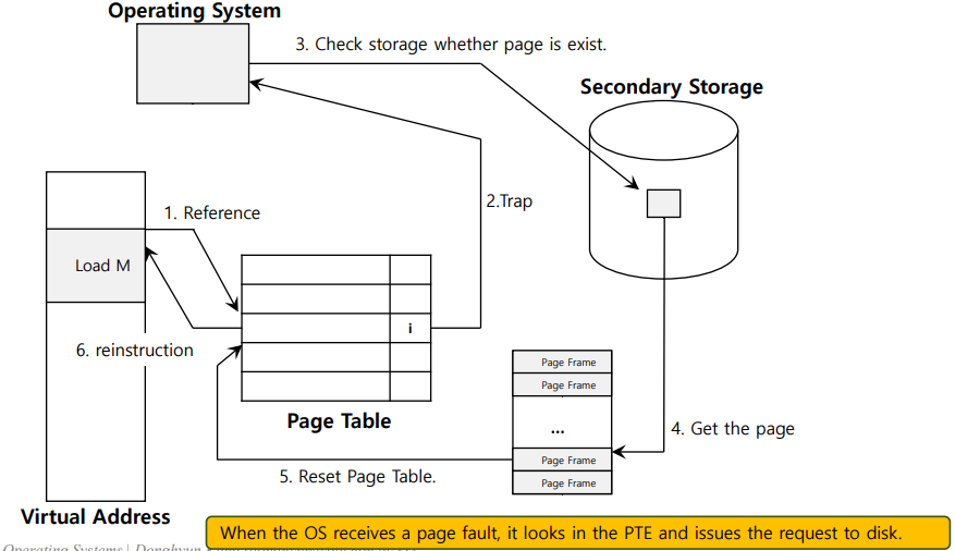 - 페이지가 존재하지 않고 디스크가 스왑된 경우, 페이지 오류를 처리하기 위해 OS는 페이지를 메모리로 스왑해야 함
