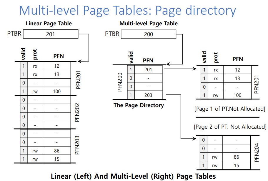 page directory는 다수의 PDE(page directory entries)로 구성, PDE는 valid bit와 page frame number(PFN)로 구성됨