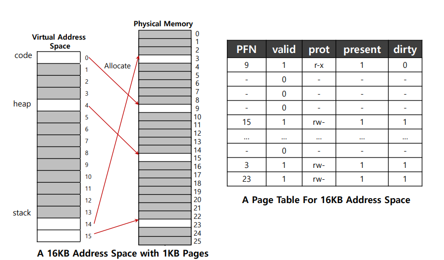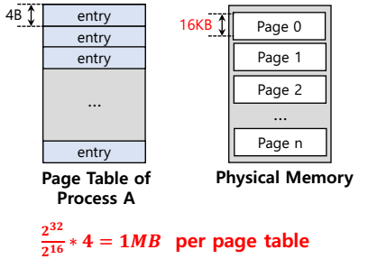 => 32bit 주소 공간에 16KB(2의 14승, 16384 => 16k) page와 4byte page-table entry 가 있다고 가정하면 페이지 테이블 크기는 2의 32승(주소공간) / 2의 14승(페이지 크기) x 4byte(페이지 테이블 엔트리) = 1MByte