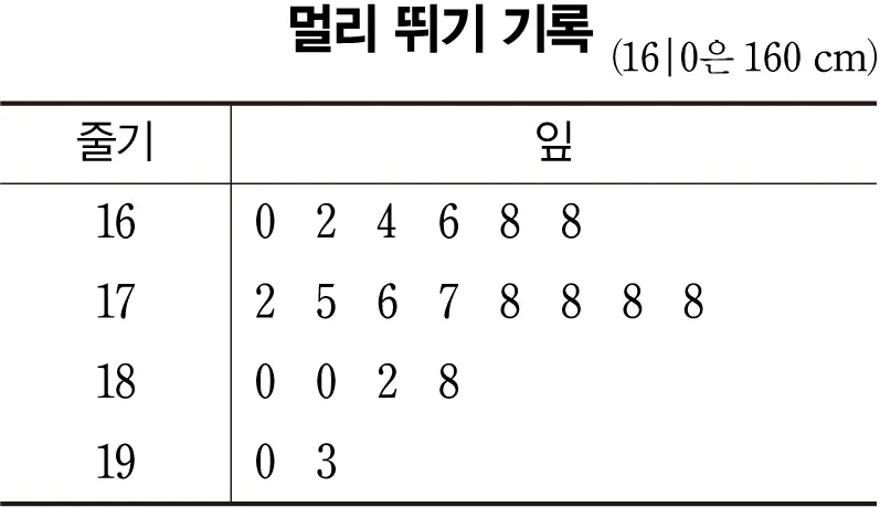 : 데이터를 분해하여 개별 데이터의 수치를 히스토그램 형태로 나타낸 그림. 잎으로 마지막 한자리 숫자, 줄기로 나머지 윗자리 숫자들을 나타냄