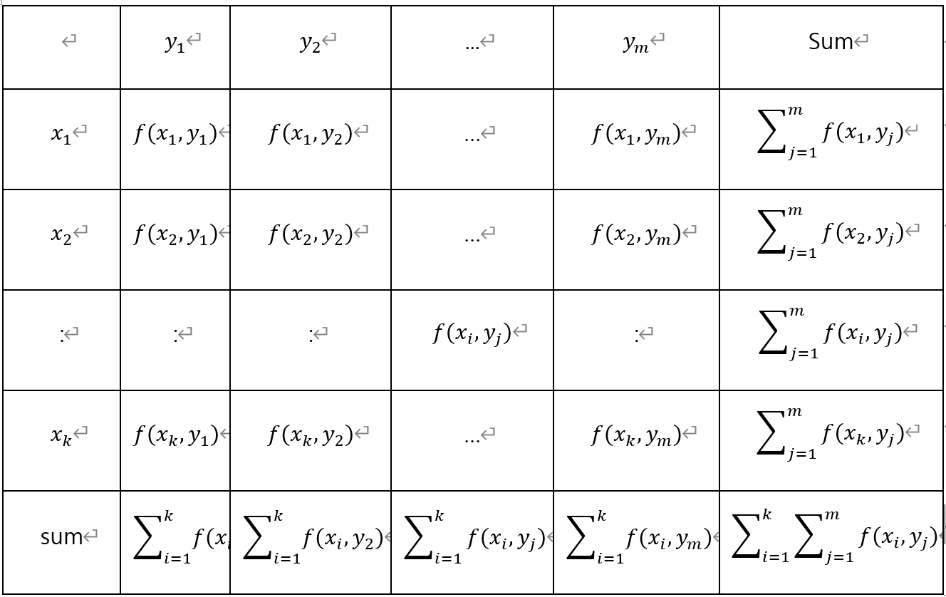 결점 유형(X = xi)와 시간 (Y=yj)을 변수로 하는 결합분포표의 경우 결합도수는 f(xi, yj)로 표기함