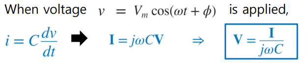 캐피시터도 phase가 90도가 넘어가서 전압(V)이 전류(I)에 비해 90도만큼 지연됨 (인덕터와 반대)