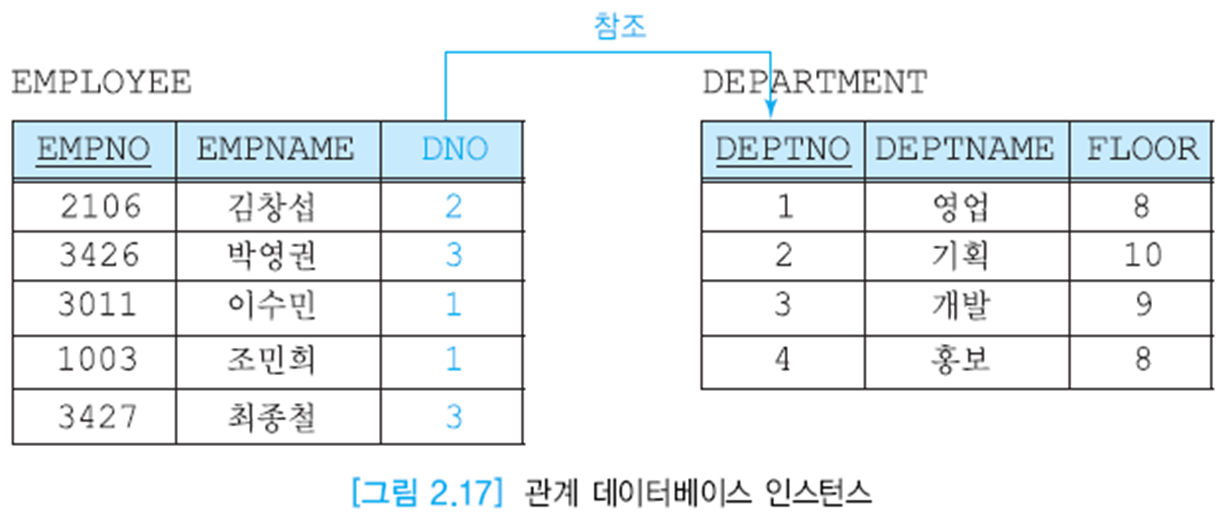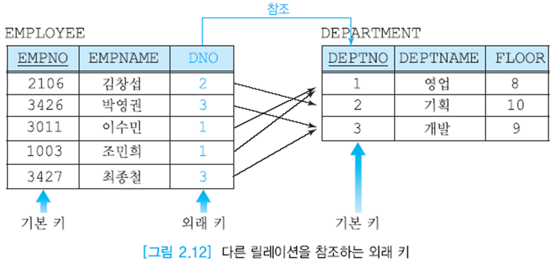 - 다른 릴레이션의 기본 키를 참조하는 외래 키