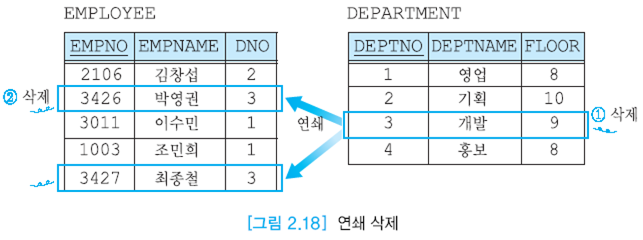 EX) DEPARTMENT 릴레이션에서 (3, 개발, 9)를 삭제하면 EMPLOYEE 릴레이션에서 부서번호 3을 참조하는 두 번째 투플과 다섯 번째 투플도 함께 삭제