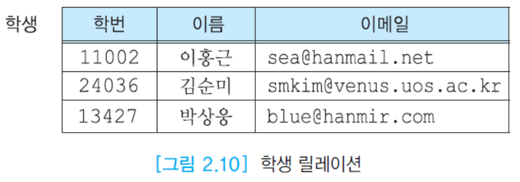 - 바탕이 되는 데이터 구조로서 간단한 테이블(릴레이션: 관계형 데이터베이스에서 정보를 구분하여 저장하는 기본 단위(하나의 집합))을 사용
