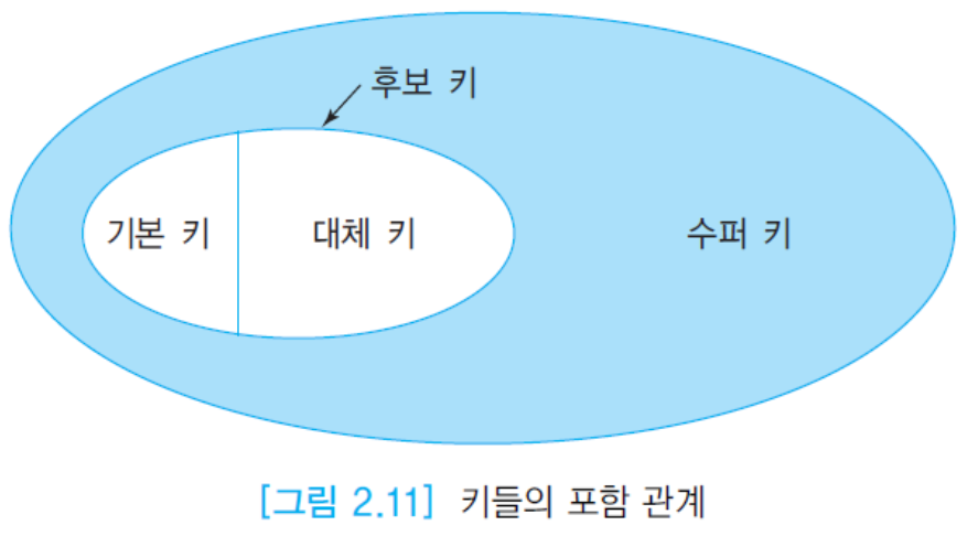 종류 : 수퍼 키(superkey), 후보 키(candidate key), 기본 키(primary key), 대체 키(alternate key), 외래 키(foreign key)